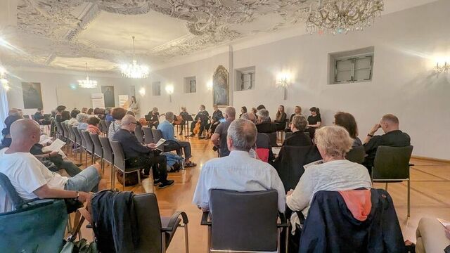 Umrahmt und thematisch gestützt wurde die Lesung durch das St.-Thomas-Consort des Johann-Joseph-Fux-Konservatoriums (Fachbereichs ,Alte Musik‘, Leitung: Claire Pottinger-Schmidt), das Auszüge aus seinem Konzertprogramm ,Da pacem‘ zum Besten gab: Mit Barock- und Renaissanceklängen von Thomas Crécquilon, Cristoforo Caresana sowie Rognoni Taeggio vermittelte das elfköpfige Ensemble die menschliche Trauer um das Verlassensein vom Glück in Kriegszeiten sowie die zeitunabhängig Botschaft vom notwendigen Frieden.