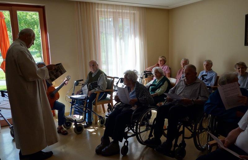 Anlässlich seines 76. Geburtstages zelebrierte Pater Simon am Freitag, dem 26. Mai 2017, um 15.30 Uhr, eine heilige Messe im Volkshilfe Seniorenzentrum Adriach. 17 Insassen des Heimes waren teils mit Rollstuhl, teils mit Rollator, zur Eucharistie in die Hauskapelle gekommen. Sie lauschten dem Evangelium nach Johannes und konnten alle die heilige Kommunion empfangen.