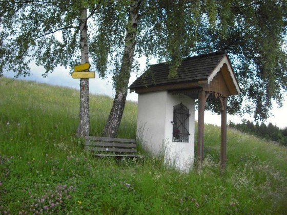 Das Sigl-Kreuz besteht aus einem stabilen Steinbau und ist mit einem Holzvordach und einem Schindeldach gedeckt, das 2005 von den Besitzern komplett erneuert werden musste. Im Inneren sieht man ein Bild vom „Ursprung des wunderbaren Gnadenbildes Maria Luschariberg“. Der Luschariberg befindet sich im österreichisch-italienischen Grenzgebiet unweit der Gemeinde Tarvis im Kanaltal. Maria Luschari ist heute ein berühmter europäischer Wallfahrtsort auf einem Aussichtspunkt, der einen herrlichen Blick auf die imposanten Berge der Gegend bietet und neben dem Pilgerweg auch durch eine Seilbahn erschlossen ist. Eine alte Überlieferung berichtet, dass dort im Jahr 1360 einem Hirt die Schafe weggelaufen waren. Kurz darauf fand er sie, kniend in einem Bergkieferstrauch. Verblüfft näherte er sich und sah im Strauch ein hölzernes, reliefartiges Bild der Gottesmutter mit dem Kind Jesu. Er brachte das Bild dem Pfarrer. Doch am nächsten Tag war das Bild auf wunderbare Weise wieder am Luschariberg, und wieder umgaben es kniende Schafe. Der Fall wiederholte sich noch ein drittes Mal. Da meldete der Pfarrer die Begebenheit dem zuständigen Patriarchen. Der gab die Anordnung, dass an der Stelle, wo das Bild gefunden wurde, eine Kapelle gebaut wird. An dieser Stelle, an der heute die Wallfahrtskirche thront, wird die heilige Maria als „Königin Europas“ verehrt.