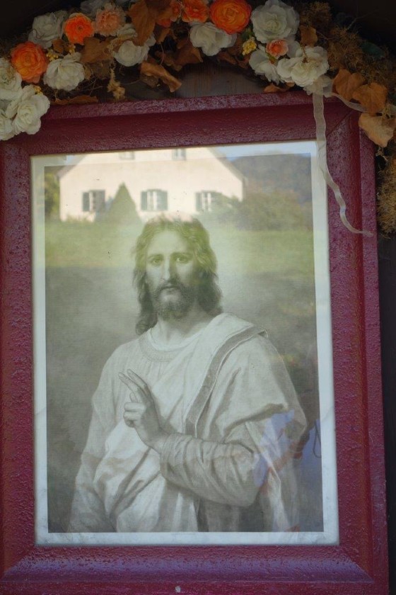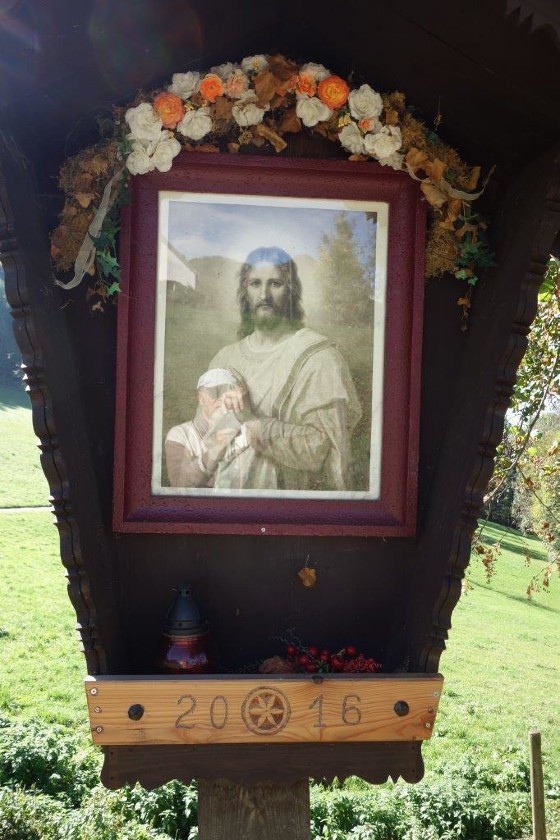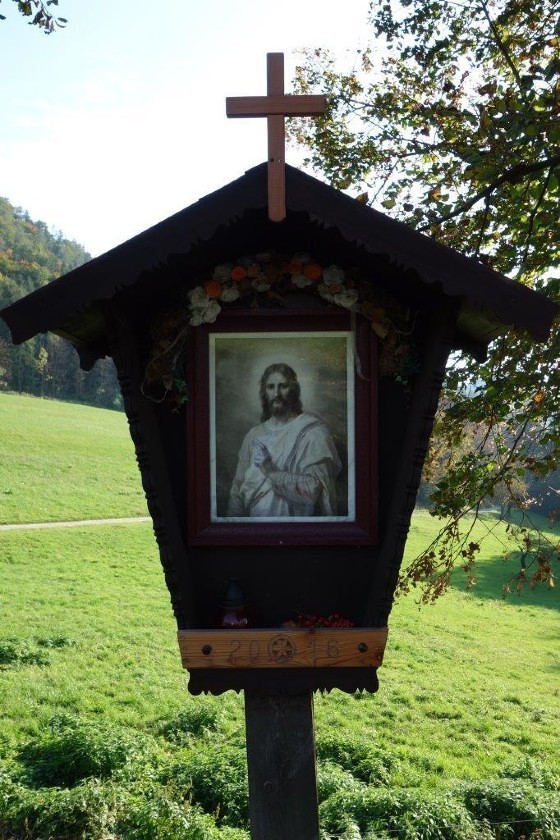 Anstelle der Skulptur befindet sich jetzt an diesem Wegkreuz ein Andachtsbild, das den segnenden Jesus zeigt, der die Vorübergehenden mit seinen Augen begleitet. Dieses wunderbare Bild erwarb Frau Pfeilstöcker auf einem Flohmarkt.